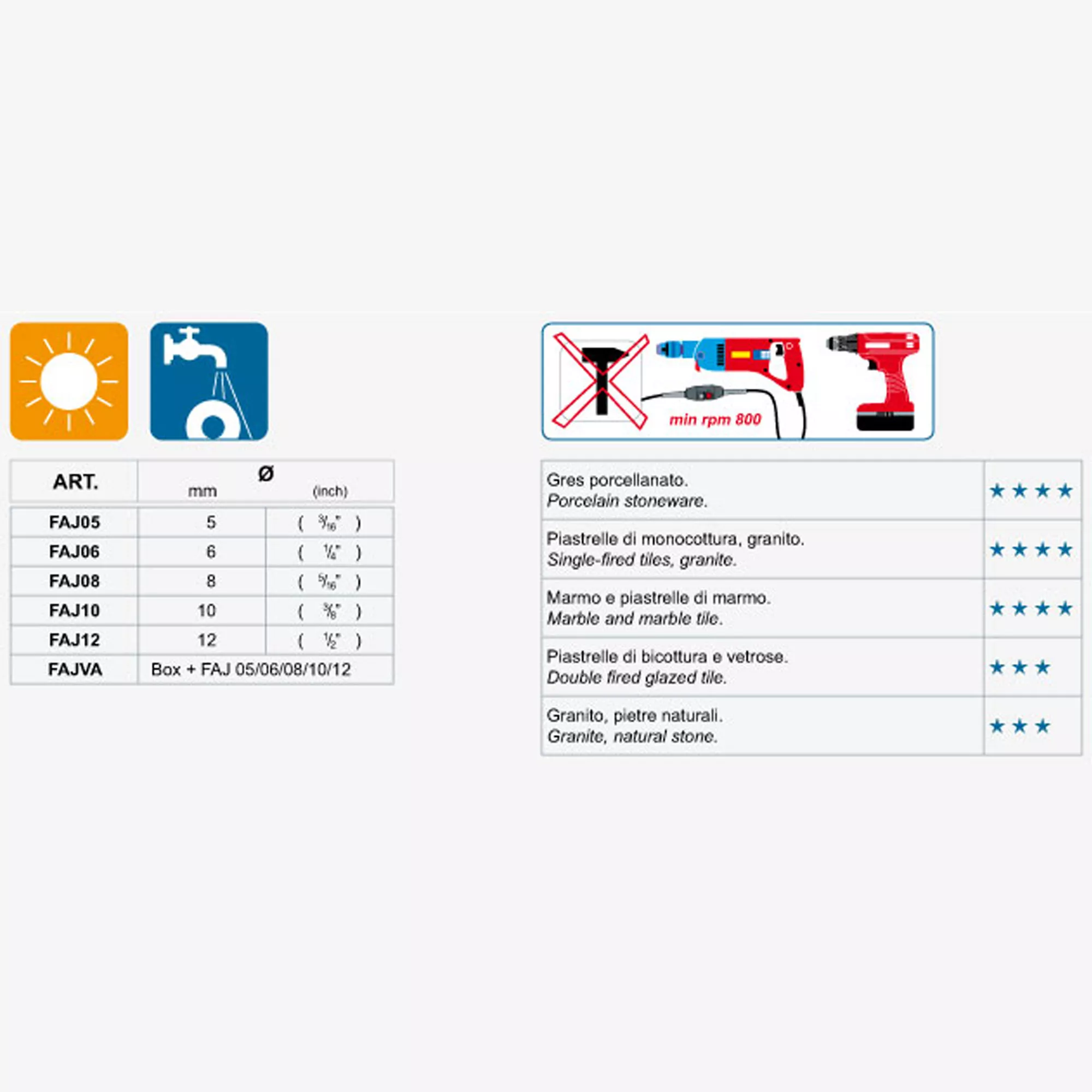 Este important ca burghiul să atingă cel puțin 800 rpm, astfel încât să se poată obține un rezultat bun cu burghiul cu diamant. Înainte de utilizare, instrucțiunile de utilizare și instrucțiunile pentru burghiu și burghiu trebuie respectate, astfel încât nimic să nu se întâmple în timpul găuririi uscate. Informațiile despre utilizarea, disponibilitatea și termenele de livrare ale articolului sunt disponibile de la serviciul pentru clienți. Prețurile afișate în magazinul online sunt prețuri unitare. Serviciul pentru clienți poate fi contactat prin intermediul liniei de asistență pentru clienți și vă va ajuta cu plăcere dacă aveți întrebări.
