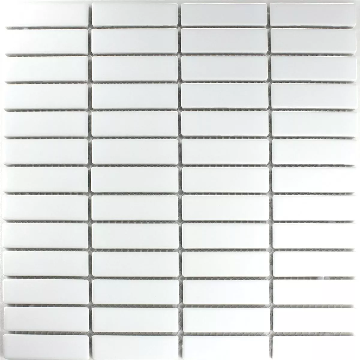 Placa de mozaic ceramic, in culoarea alb si finisaj de suprafata mat, are dimensiunea mat de 298x318mm si dimensiunea piatra de 21.9x72.8mm. Grosimea pietrelor individuale este de 0,6 cm.