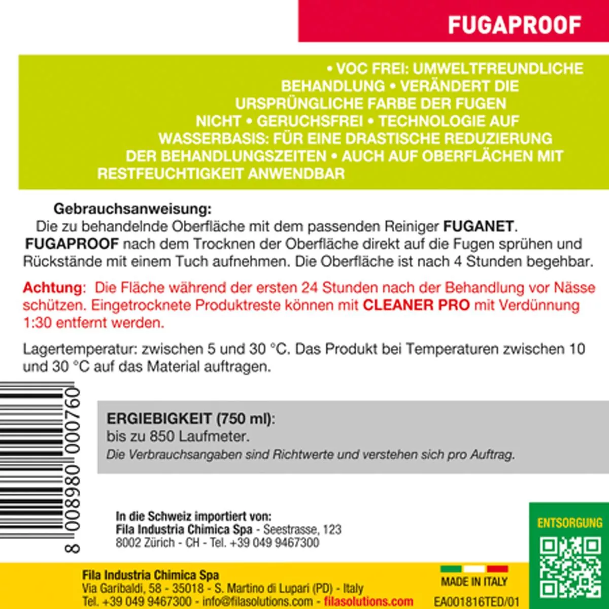 Protejați zona de umezeală în primele 24 de ore după tratament. Reziduurile de produs uscat care nu au fost îndepărtate în timpul aplicării pot fi îndepărtate cu EASYWASH sau CLEANER PRO diluat 1:30.