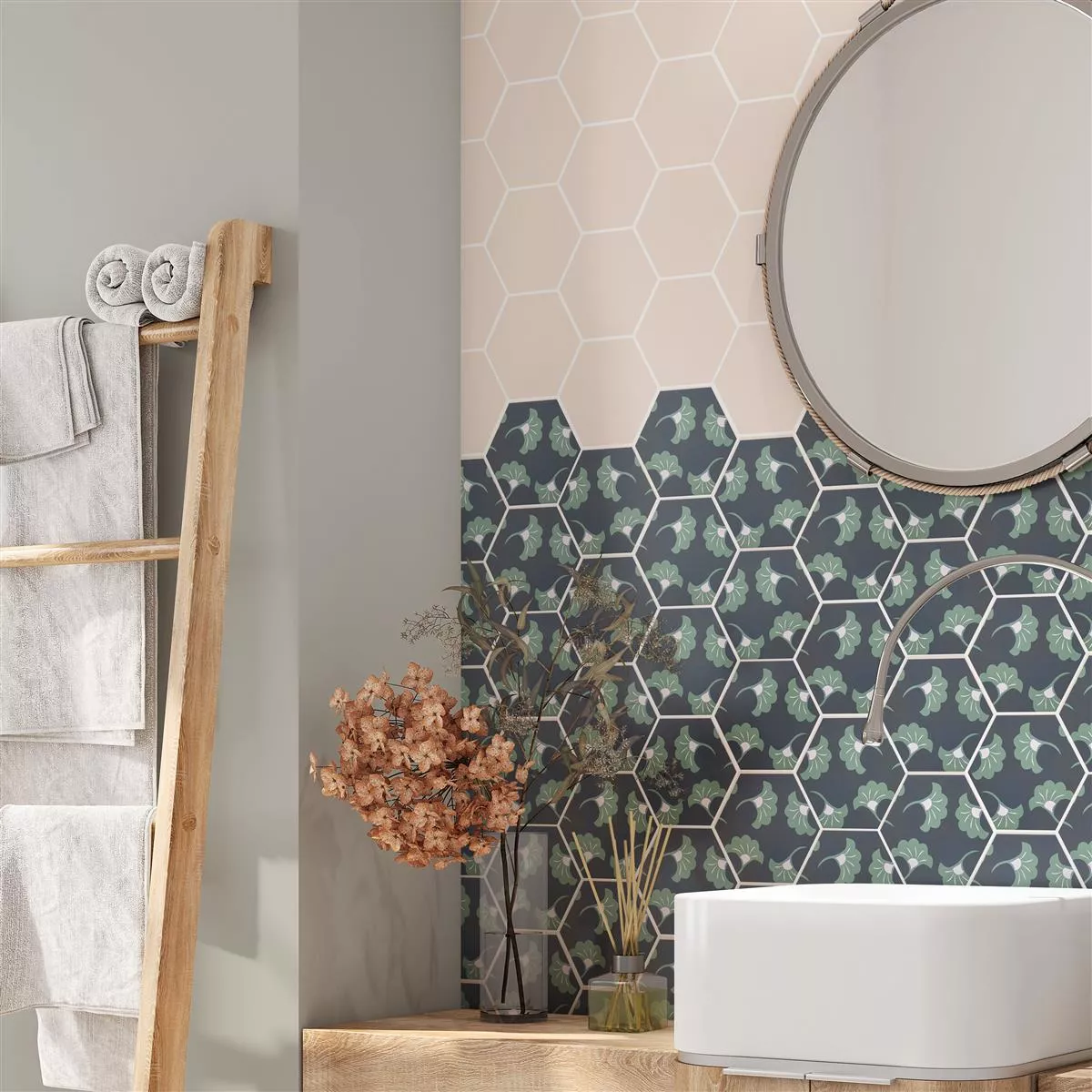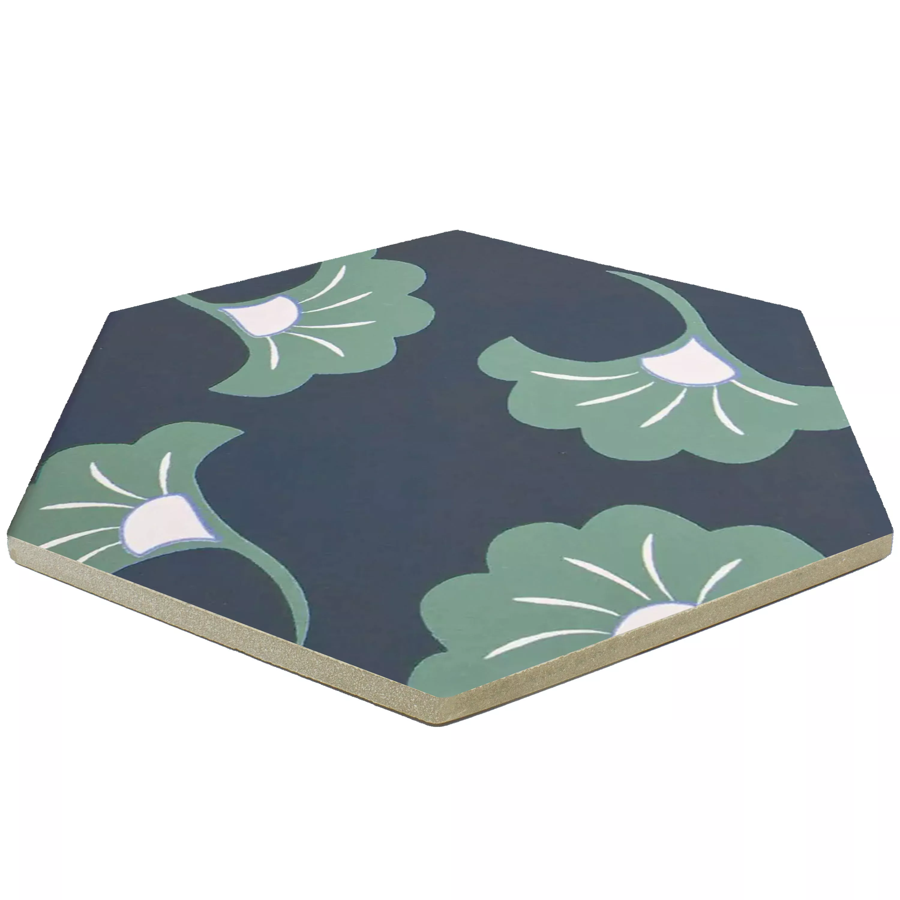 Placile din gresie portelanata „Modena Hexagon Decor 3” imbina arta si functionalitatea. Cu o grosime de 10 mm, sunt ideale pentru zonele umede, dusuri, bai, bucatarii, living si zone interioare. Suprafața mată și motivul ornamental în albastru și verde conferă plăcilor o estetică unică.