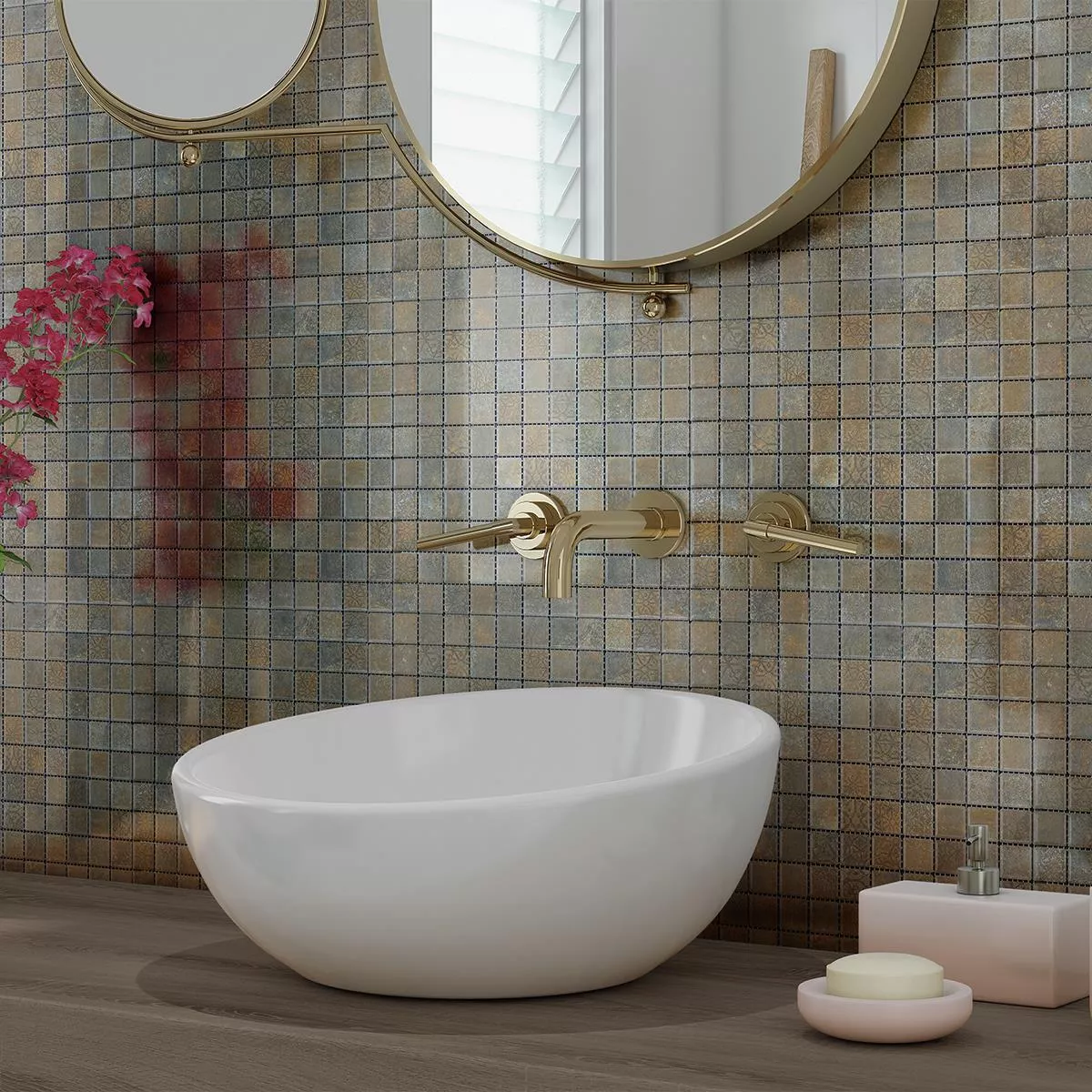 Lățimea rostului de 2 mm asigură un aspect curat și uniform al îmbinării, care evidențiază în mod optim aspectul maro ruginiu metalic. Cu mozaicul Lusco alegi o combinație unică de estetică și funcționalitate care creează un aspect distinctiv în fiecare cameră.