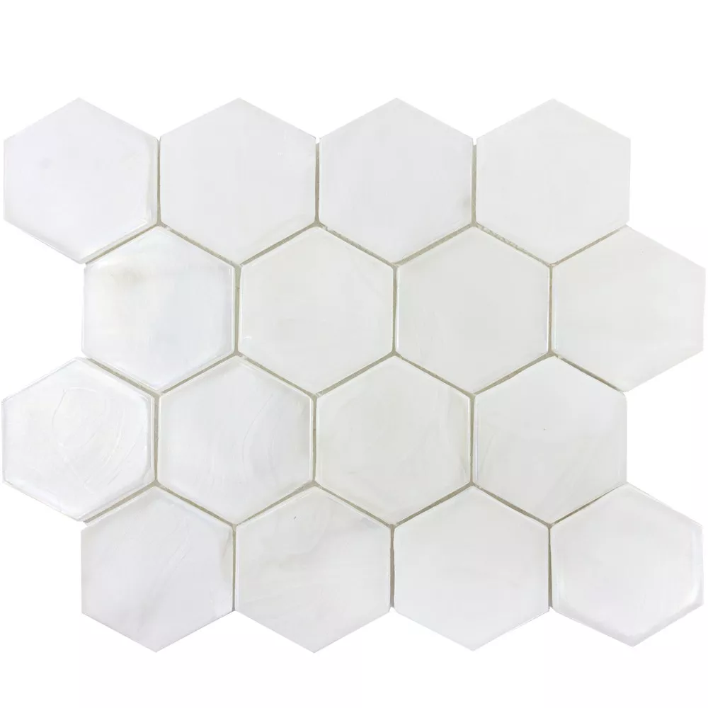 Placile de mozaic de sticlă Andalucia Hexagon în alb se prezintă ca elemente de design sofisticate și atemporale pentru pereți pentru camere precum baie, bucătărie, sufragerie și duș. Albul strălucitor conferă plăcilor o estetică lejeră și aerisită, care emană eleganță și modernitate. Suprafața lucioasă aduce o strălucire subtilă încăperii.