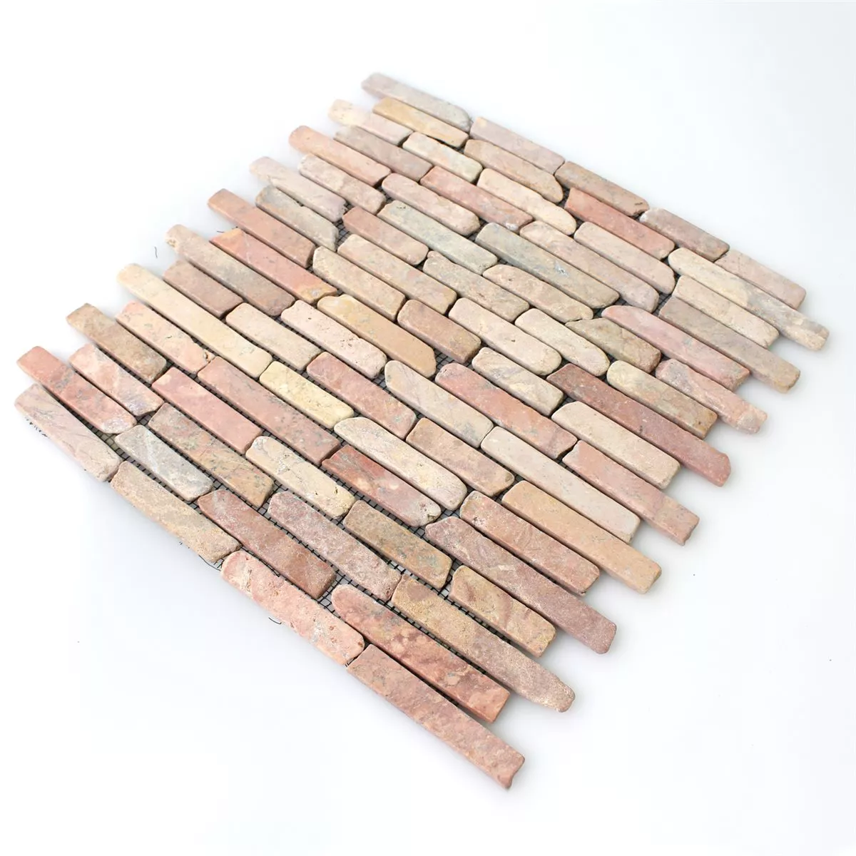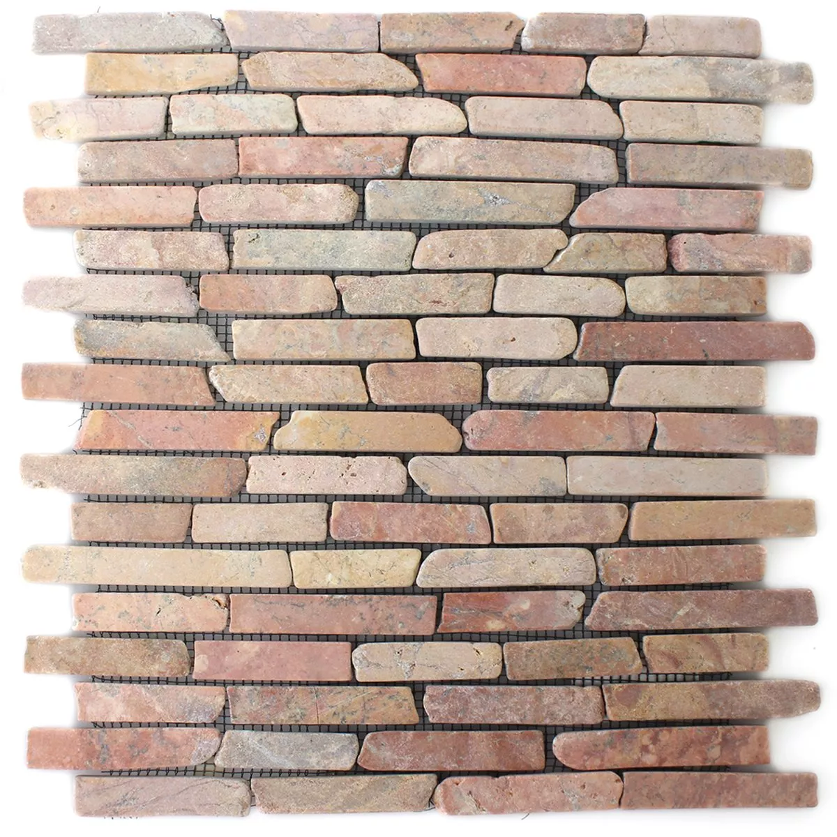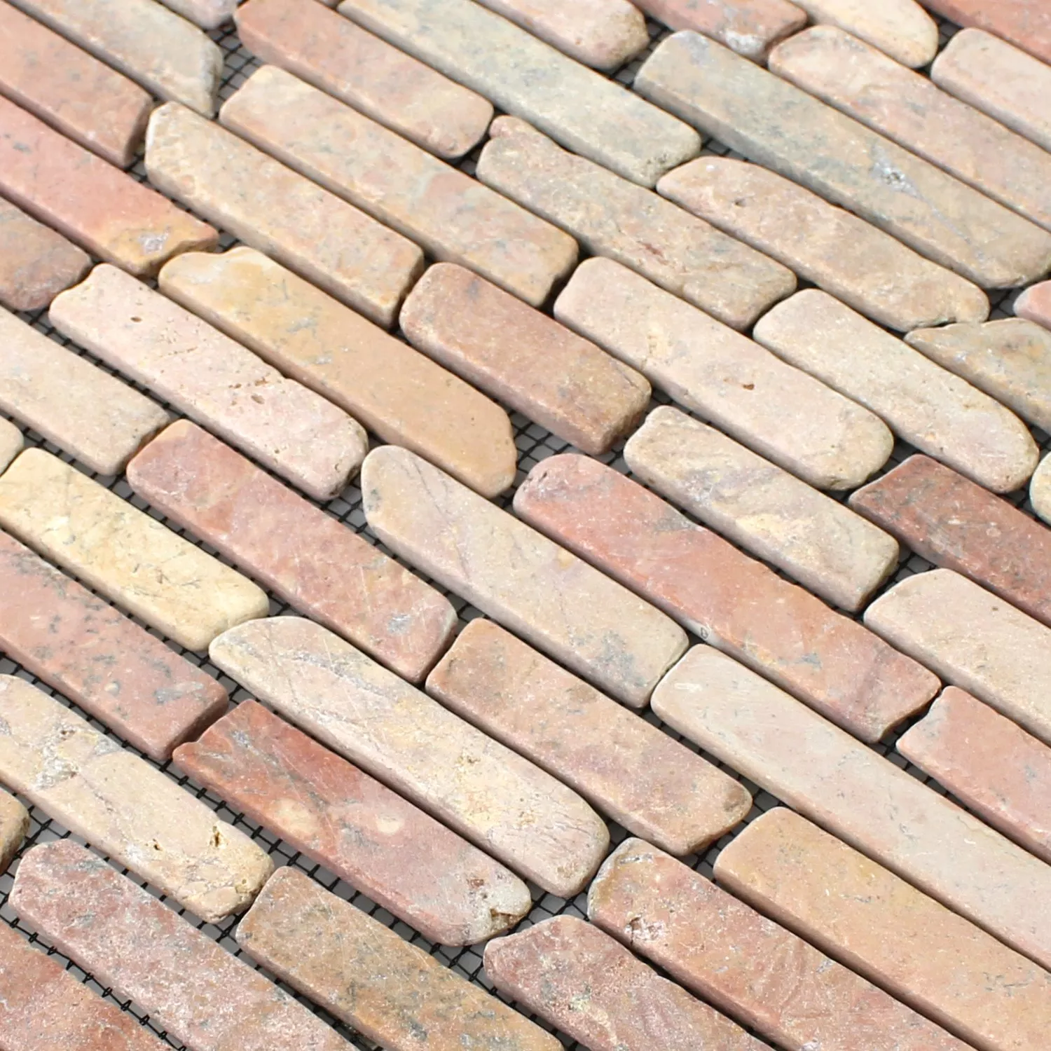 Placile de mozaic de înaltă calitate din seria Bali Bricks sunt realizate din marmură reală. Prin urmare, aceste plăci din piatră naturală evocă o notă de eleganță și lux în fiecare cameră a casei. Mozaicul fin de marmură este răsturnat, astfel încât suprafața acestor plăci de mozaic arată foarte natural. În ceea ce privește culoarea, aceste plăci din piatră naturală oferă un aspect foarte atrăgător din punct de vedere vizual, deoarece mozaicul elegant de marmură este alcătuit din diferite culori. Seria Bali Bricks impresionează prin tonurile sale de roșu moale și alb strălucitor. Acest model este un amestec de placi de mozaic Rosso Cream si Bianco, astfel incat placile Bali Bricks pot fi usor combinate si cu celelalte placi din piatra naturala. Camerele mai mari, în special, pot fi decorate inteligent cu gresie în diferite culori.