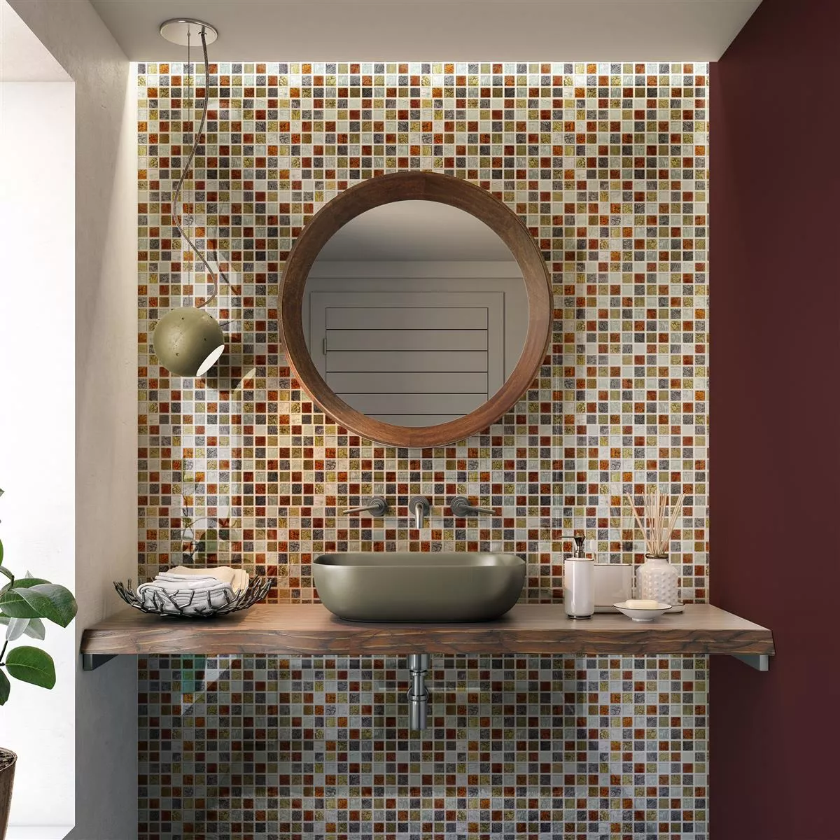 Placile de mozaic din sticla cristal Bonnie Structure in rosu, auriu si argintiu sunt o alegere eleganta pentru orice incapere. Pot fi folosite ca placi de accent sau decorative in diverse zone pentru a crea o atmosfera sofisticata si luxoasa.