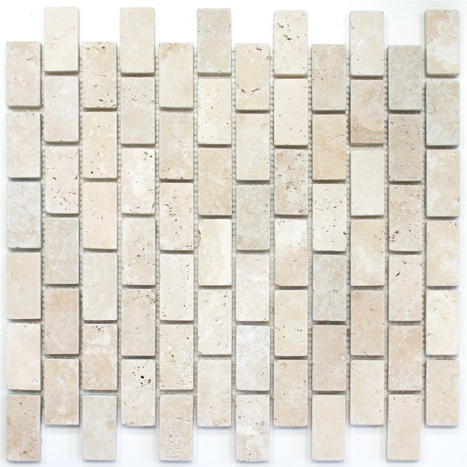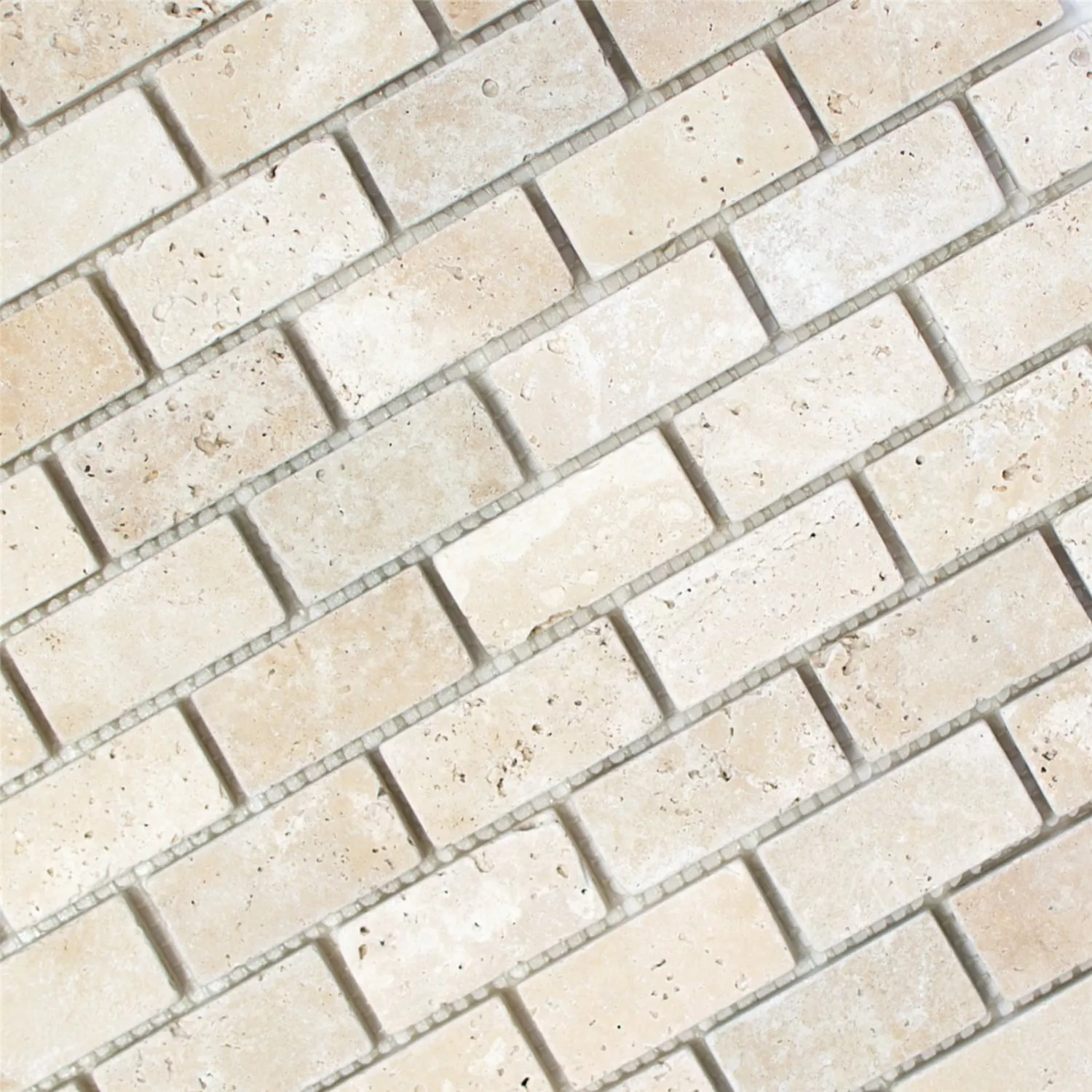 Mit den Travertin Mosaikfliesen Barga beige Brick lässt sich auch eine Verlegung als "Römischer Verband" realisieren. Für diesen Zweck fertig zusammengestellte Fliesenpakete erleichtern diese Aufgabe zusätzlich. Durch eine Kombination der verschiedenen Fliesenformate und den Mosaikfliesen lassen sich Oberflächen gestalten, die an Einzigartigkeit nicht mehr zu übertreffen sind. Mit diesen Fliesen sind der Fantasie keine Grenzen gesetzt.
