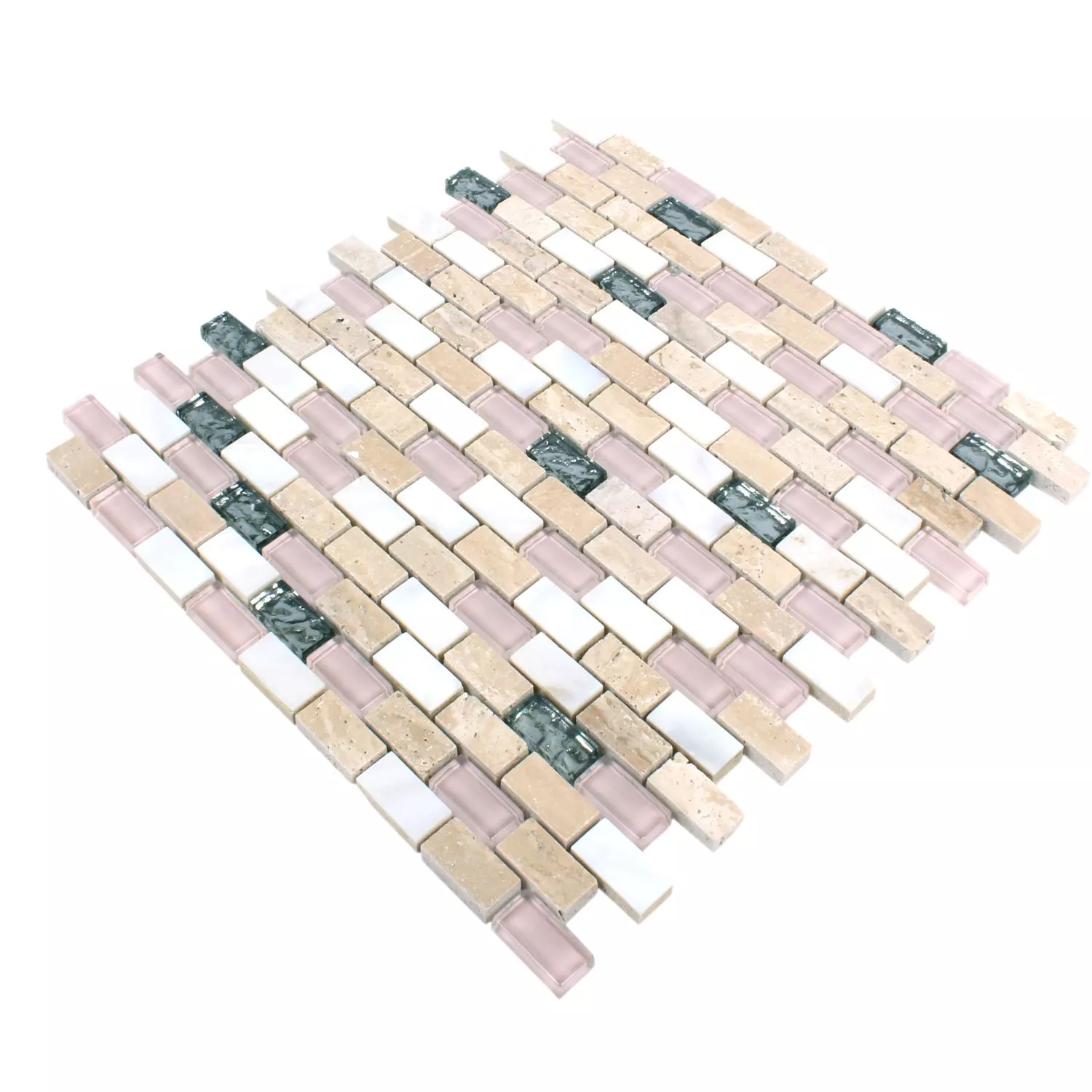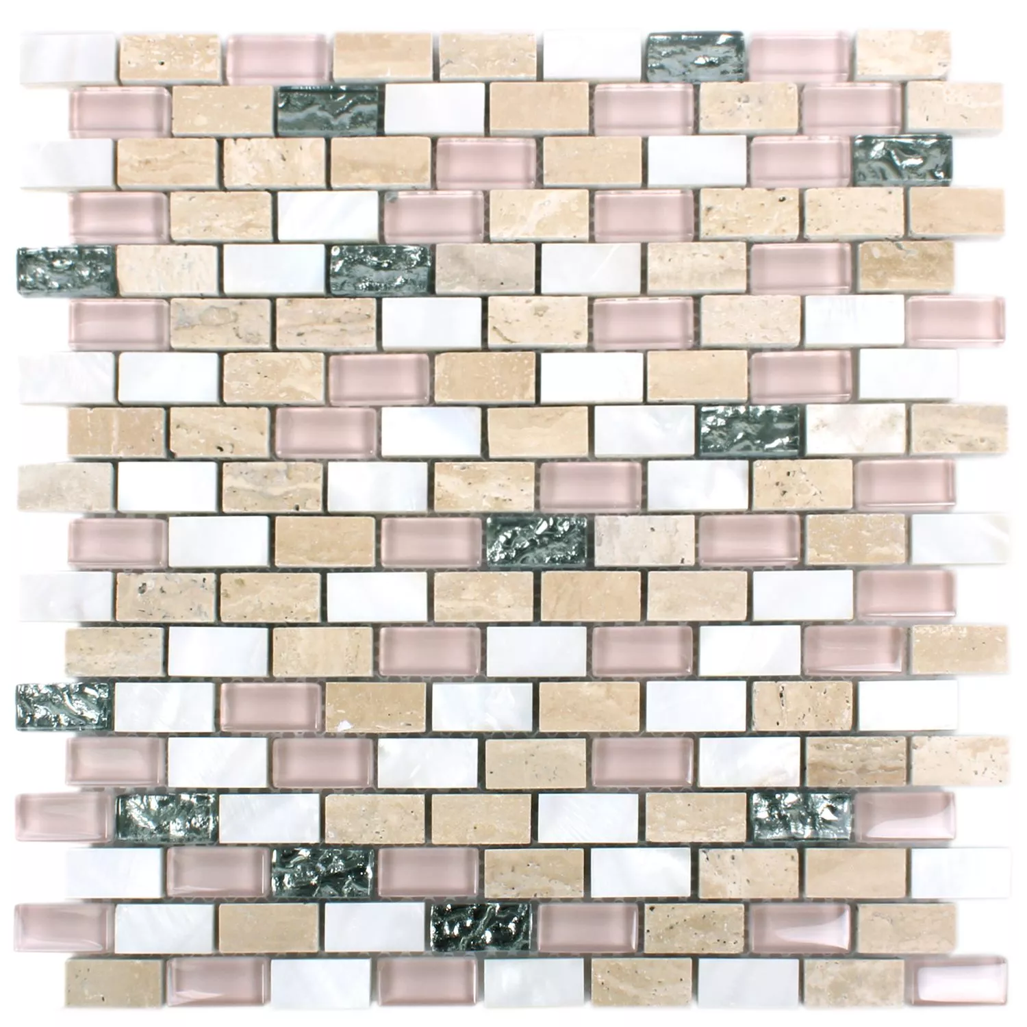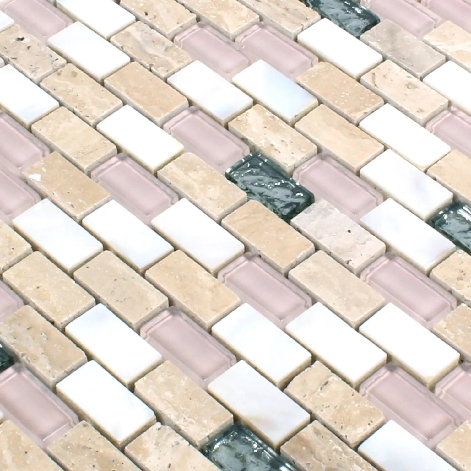 Aceste plăci din piatră naturală sunt disponibile în alb și bej-roz. La așezarea acestor plăci din piatră naturală, mozaicul de sticlă neregulat creează un fler deosebit de impresionant și elegant. Aceste gresie sunt pur și simplu prima alegere ca gresie pentru baie. Placile de perete pot fi așezate rapid și în siguranță deoarece sistemul de covoraș al mozaicului de sticlă vă permite să lucrați pe suprafețe mari. Ca și faianță, acest produs oferă modalitatea optimă de a crea tapetări rapid și foarte precis. Plăcile de mozaic de acest tip se caracterizează și prin robustețe și durabilitate. Acestea sunt plăci de piatră naturală care sunt deosebit de potrivite ca plăci de mozaic ca plăci de baie.