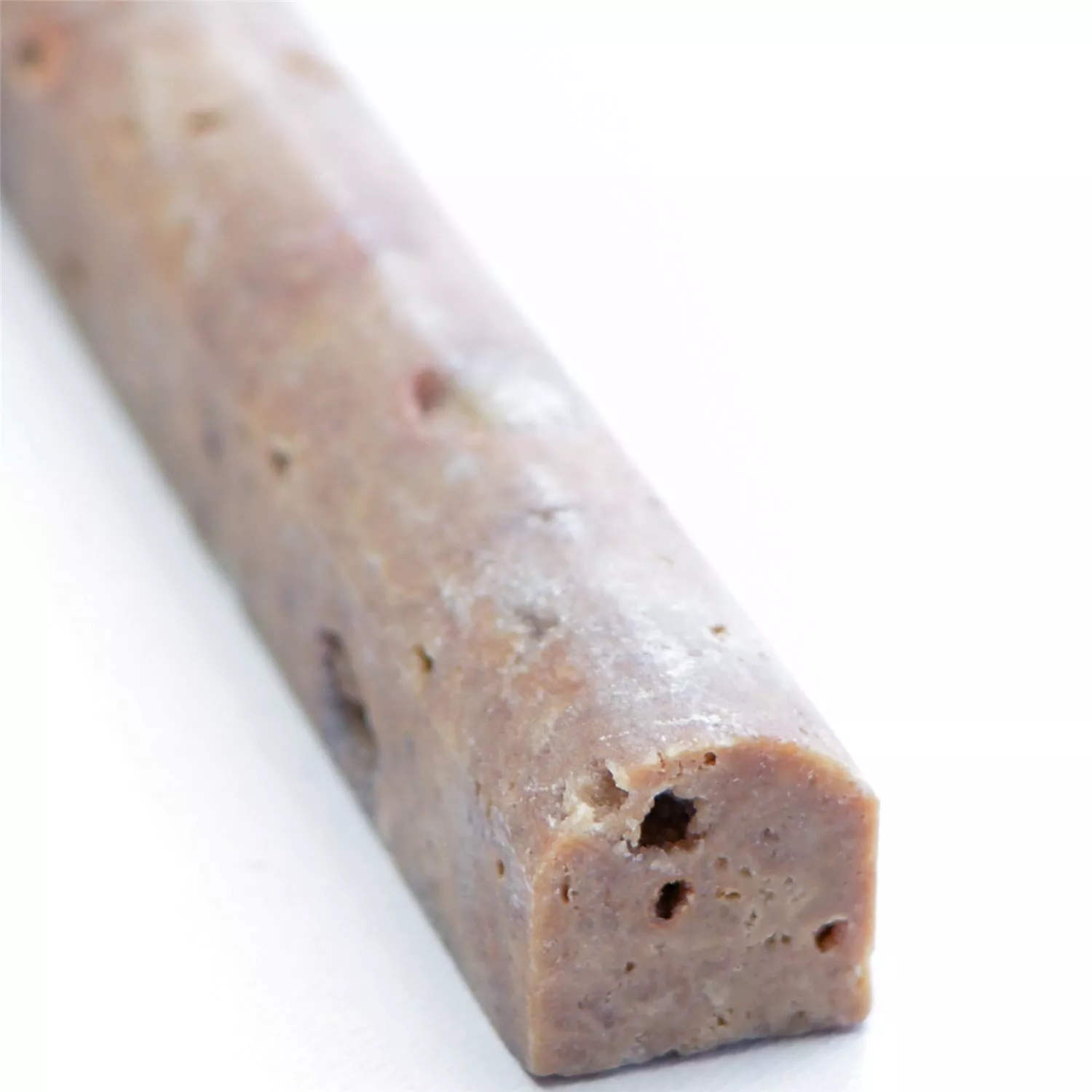 Die Natursteinfliesen Travertin Bordüre Patara Noce bestehen aus terrestrischer Sedimentgestein, der durch einen Prozess der schnellen Ausfällung von Kalziumkarbonat an der Mündung von heißen Quellen oder in Kalksteinhöhlen gebildet wird. Travertin Patara Noce hat oft ein faseriges oder konzentriertes Aussehen und besteht in weißer, brauner, cremefarbener und rostiger Sorte. Diese Natursteinfliesen bringen einzigartige Wärme in Küchen, Wohnräume und Bäder. Travertin wird häufig in modernen Häusern als ein natürliches und stabiles Baumaterial verwendet.